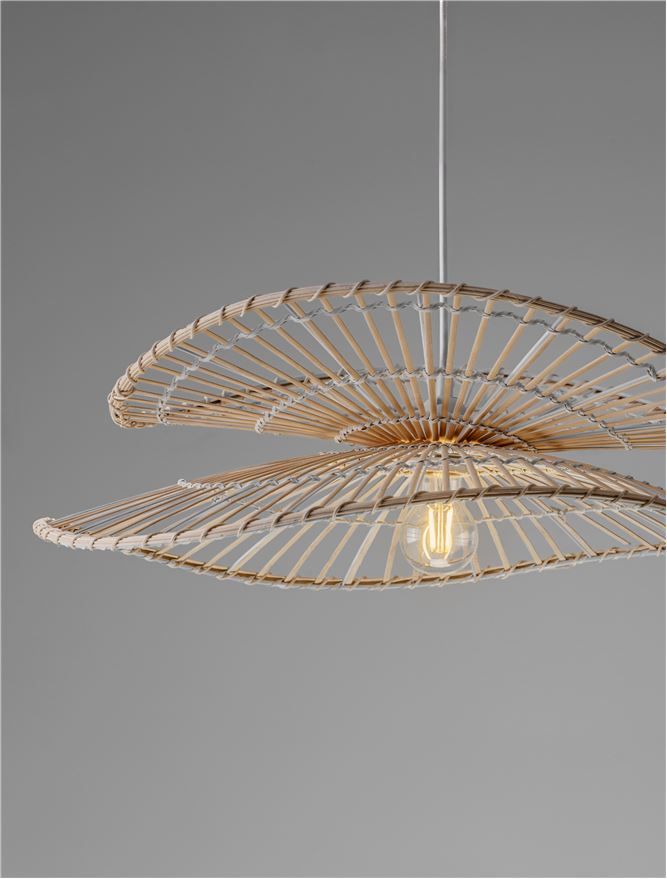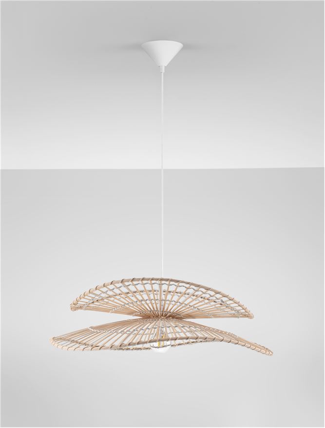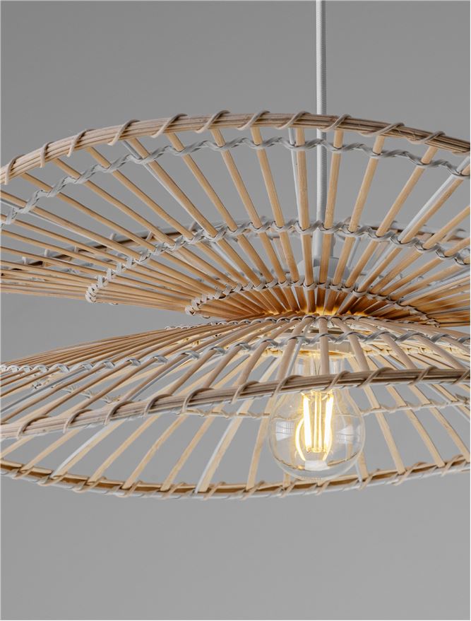 A Natural, organic Bamboo & Rattan pendant with a large 60cm radius and a smart Sandy white steal conical ceiling rose.