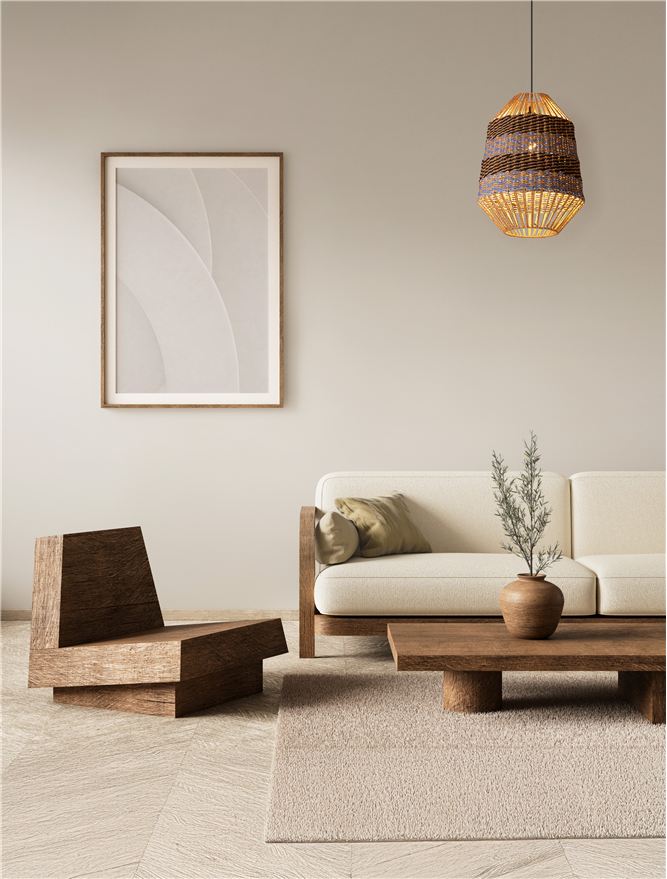 A Natural, organic pendant made with Blue & Black Rope and a smart Sandy black steal conical ceiling rose.