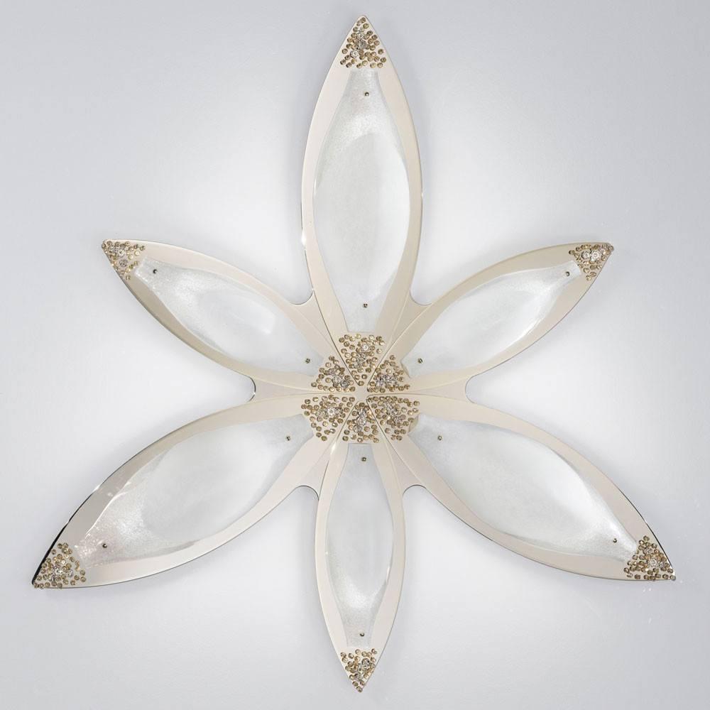 Throwing eyes to heaven, in a bright moonlit night, was born the "Crystal Moon" collection. An elegant white Murano glass handmade creates an emotional luminous effect enhanced by brilliant SWAROVSKI ELEMENTS gems. All wrapped by a sinuous metal frame that reveals magic and atmosphere to environments. Minuteness and refined details that make "Crystal Moon" the celestial sphere of illumination.