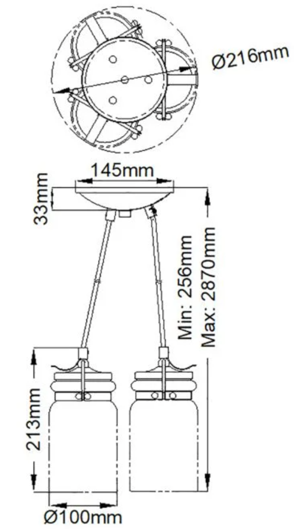 Overall diameter 216mm x minimum-maximum drop 256 - 2870mm.